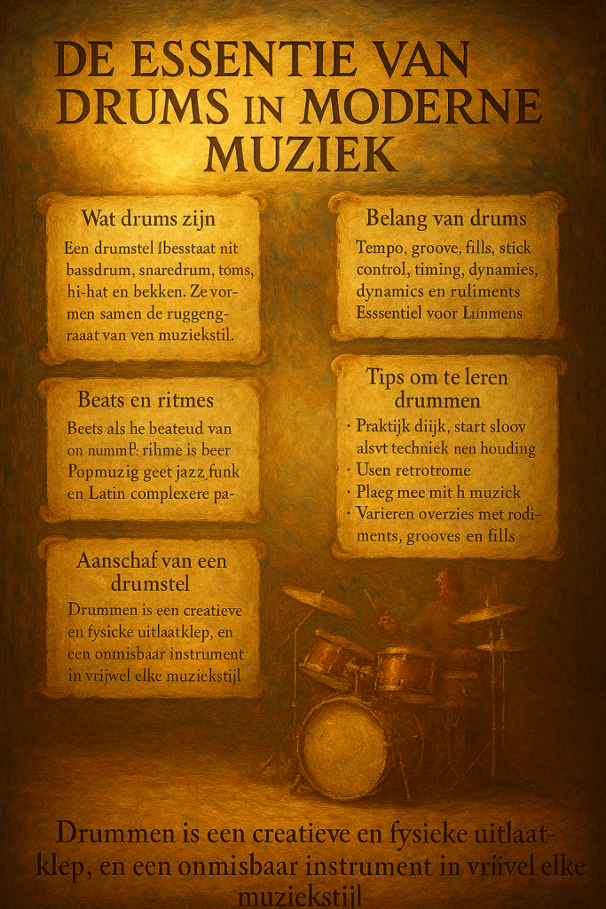 Drums vormen vaak de fundering van moderne muziek. Ze bepalen de groove en de dynamiek van een nummer. Een goede drummer kan een simpel lied opwindend maken door zijn gevoel voor timing, accenten en variatie. Zonder drums zouden veel nummers vlak en richtingloos aanvoelen.