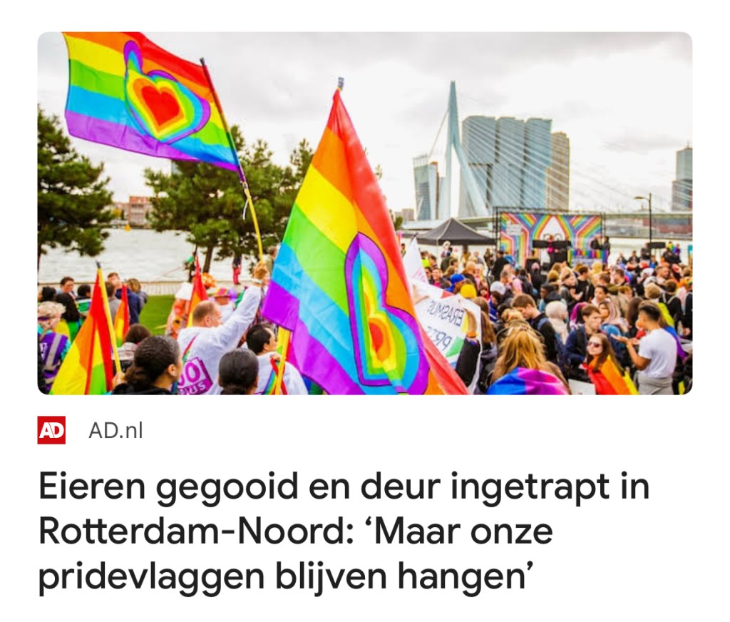 ROTTERDAM-NOORD – Het is weer zover. Weer eieren, weer een ingetrapt deur, weer de regenboogvlaggen die het doelwit zijn. En wat doet de gemeente? Wat doen de buurtwerkers? Wat doen we eigenlijk zélf om te voorkomen dat deze k*tzooi zich blijft herhalen?! Ik word er simpelweg gestoord van.