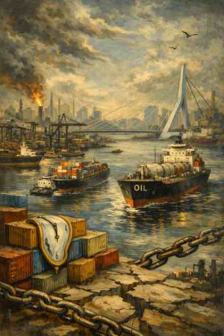 Het is makkelijk om geopolitiek te zien als iets abstracts, iets dat zich afspeelt in verre woestijnen en marmeren paleizen. Maar in Rotterdam voel je het in de lucht. In de haven. In de prijs van een liter diesel. In de energierekening die weer omhoog kruipt. In de logistieke ketens die haperen wanneer de Straat van Hormuz dichtgaat of wanneer olieprijzen exploderen door bombardementen.